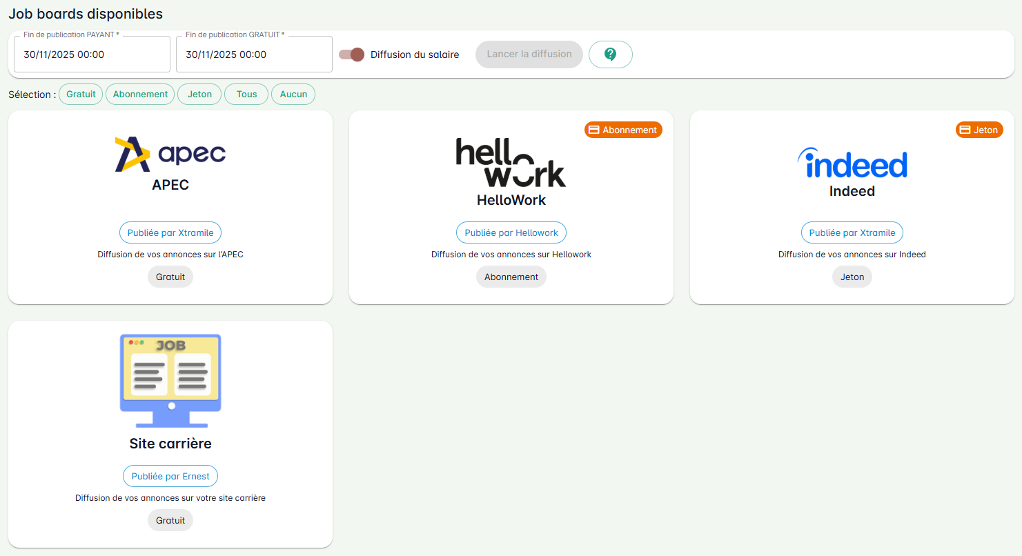- Sur les jobboards : cochez la case Diffusion du salaire puis validez en cliquant sur Lancer la diffusion ;
