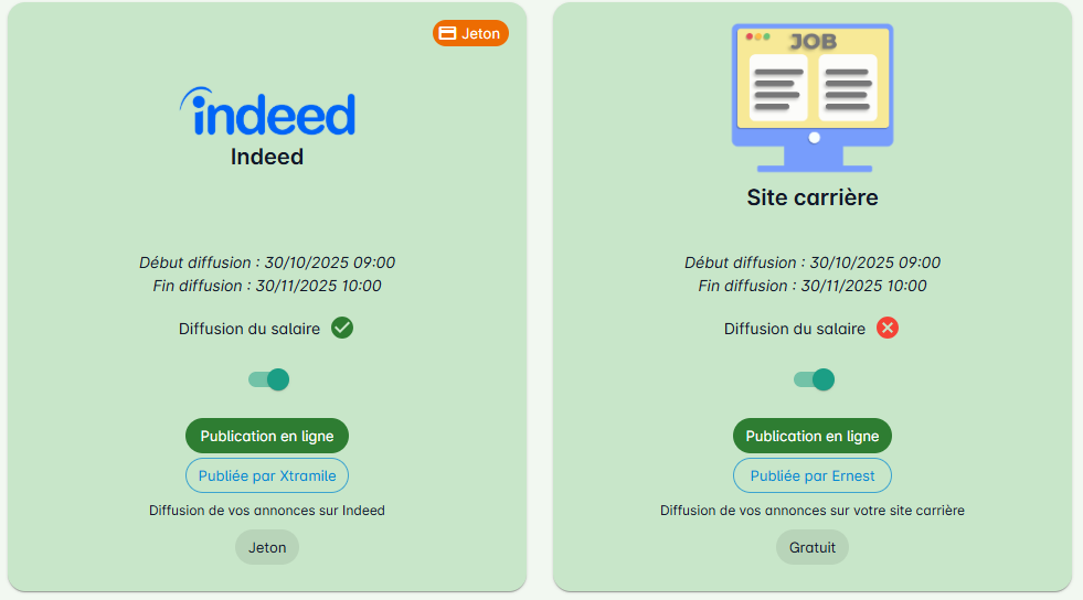 Exemple : si vous activez ce paramètre sur un jobboard Xtramile puis le désactivez sur un autre jobboard Xtramile, il sera désactivé pour tous les jobboards Xtramile. Les autres diffuseurs (ex : Hellowork) ne seront pas affectés.